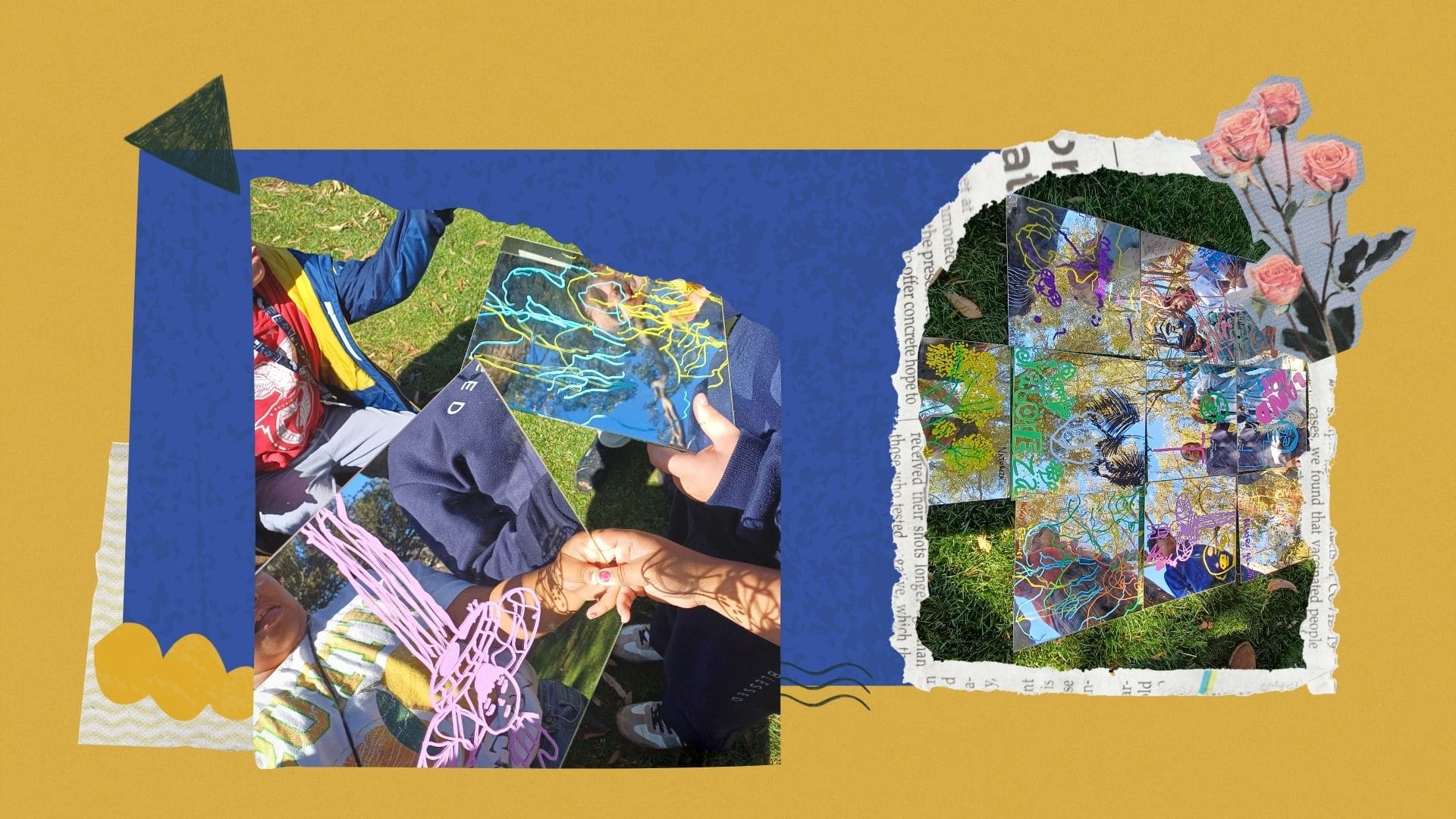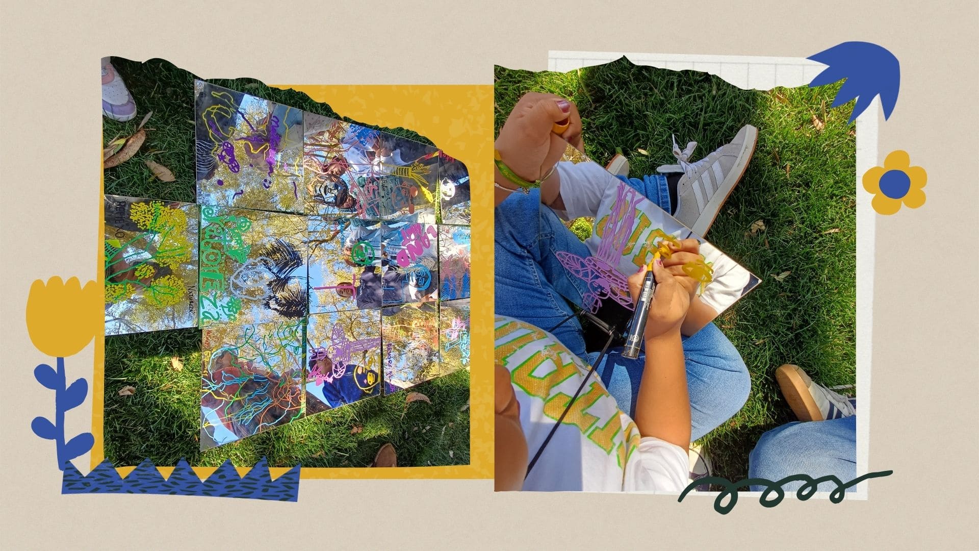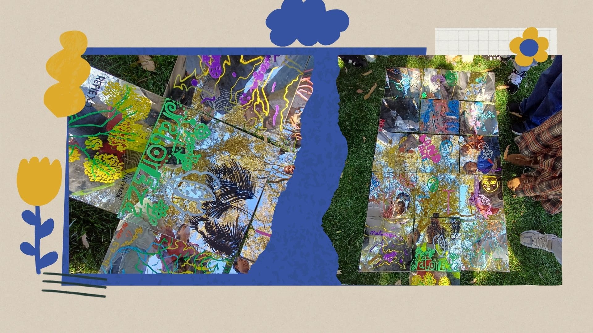 No final, todos os espelhos foram reunidos, formando um puzzle coletivo de turma, criando uma composição artística que refletiu a diversidade de olhares, emoções e aprendizagens vividas ao longo desta visita.