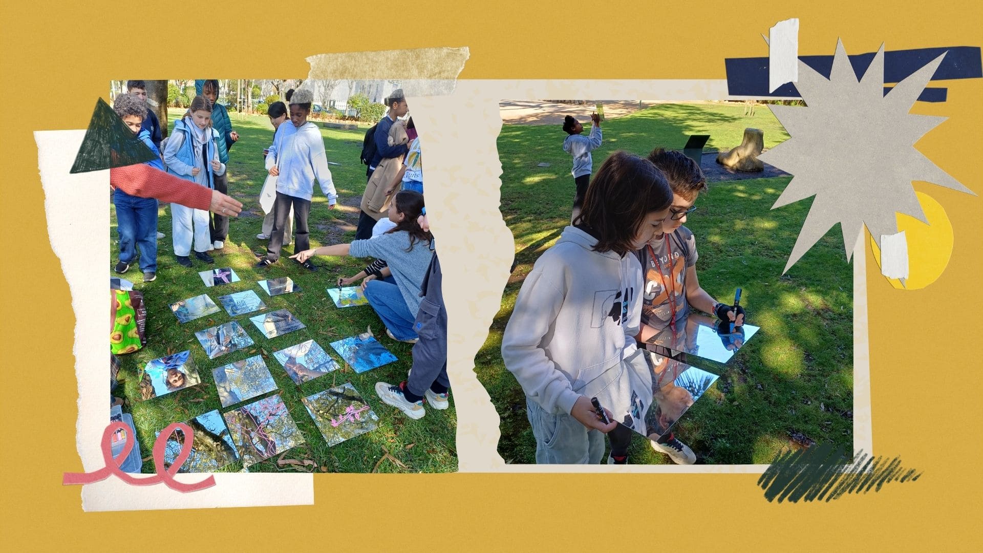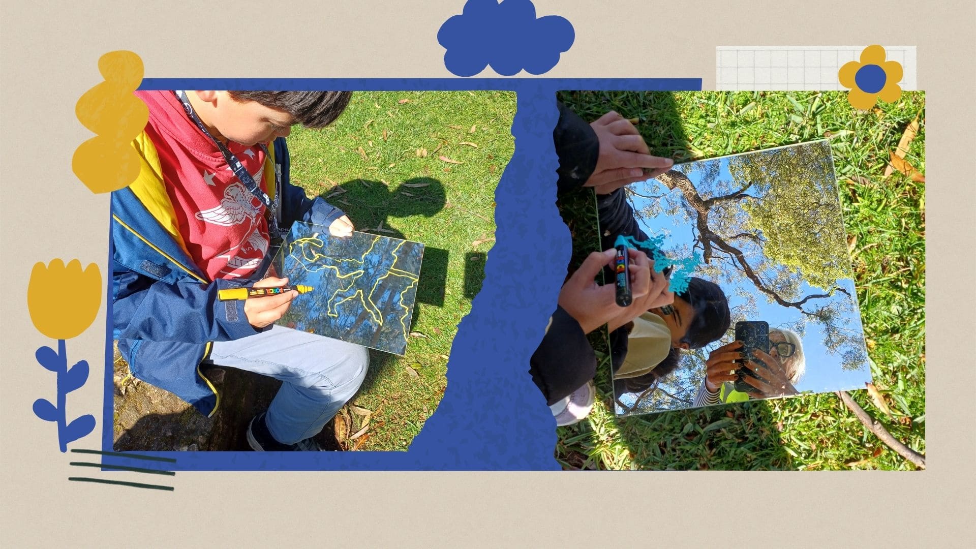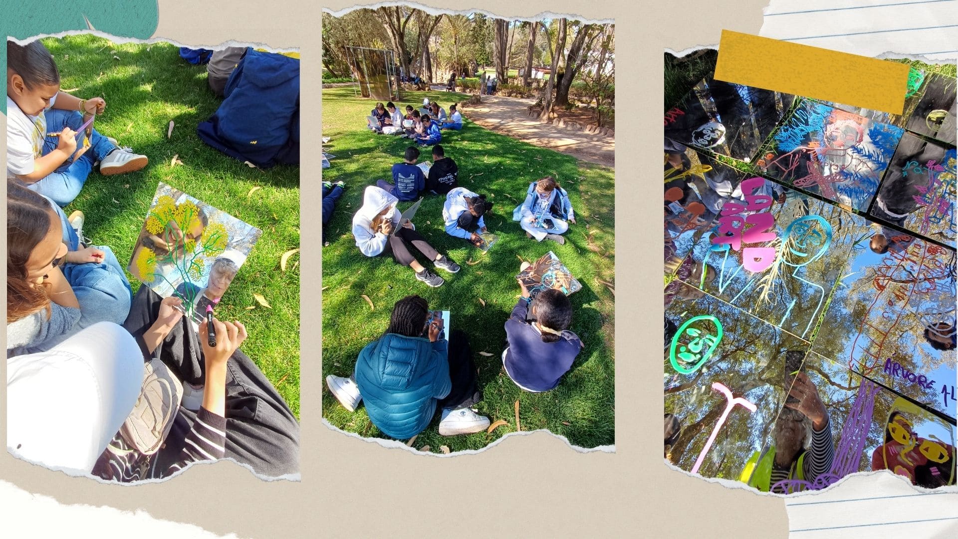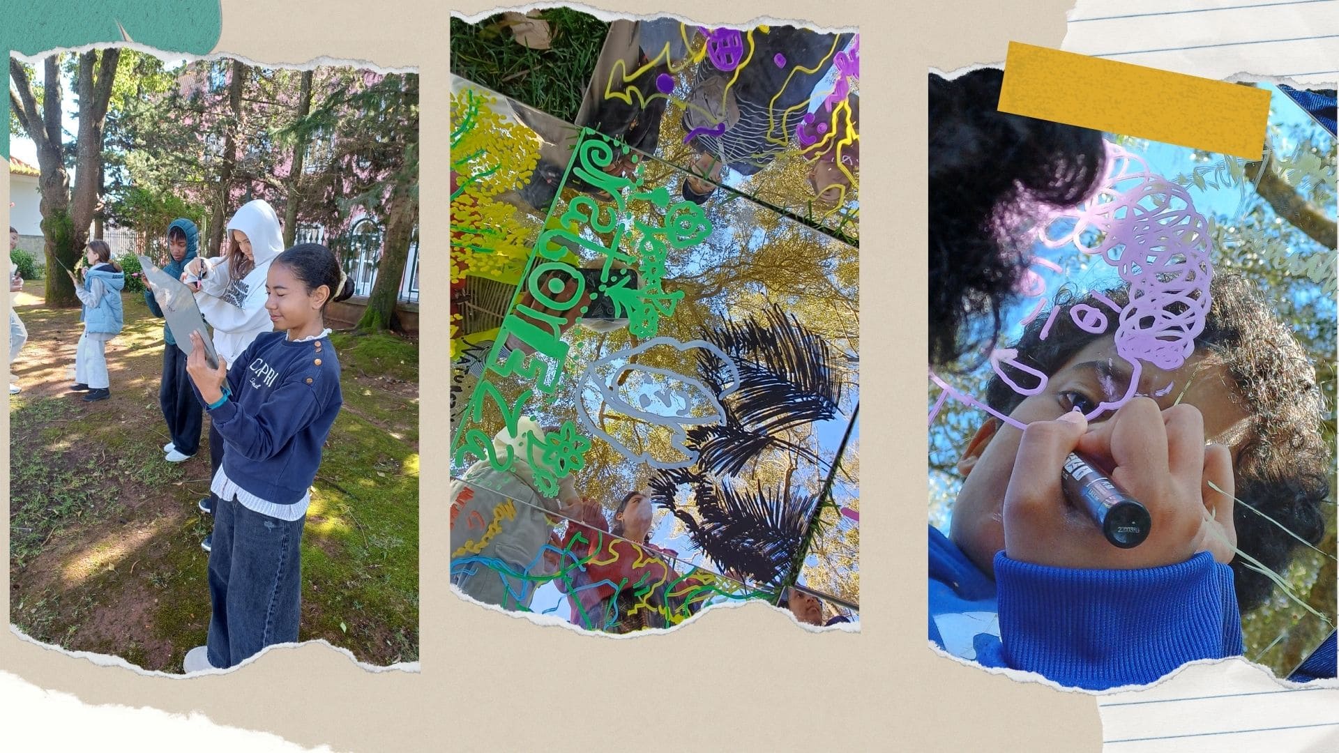 Para além destas atividades, os alunos desenvolveram ainda uma proposta artística intitulada “Reflexo”. Nesta atividade, cada aluno desenhou num espelho o reflexo da natureza que observava no parque, integrando também o seu autorretrato. Para completar o trabalho, cada aluno escreveu uma palavra que simbolizasse aquilo que aprendeu ou sentiu durante esta experiência.