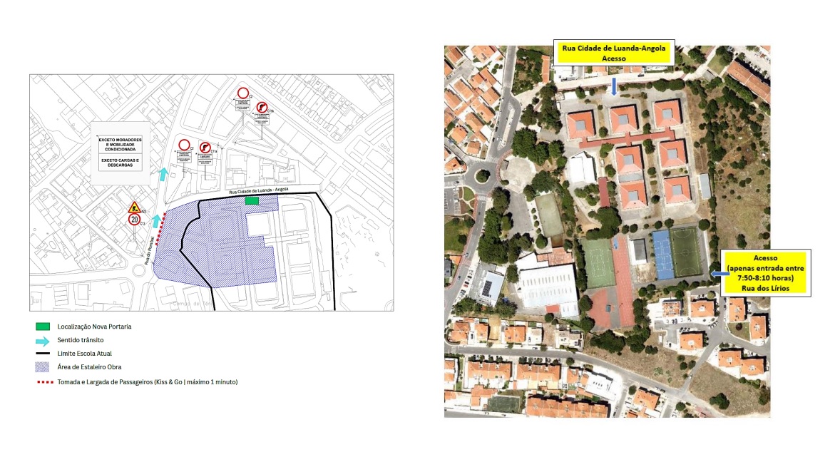 A partir de 14 de outubro de 2025, devido às obras na Escola Básica e Secundária Ibn Mucana, o acesso principal será pela nova portaria da rua Cidade de Luanda-Angola, com trânsito restrito a residentes e serviços específicos. Mantém-se o acesso pedonal e a faixa de largada na rua do Pombal.